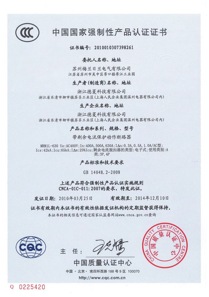 MRM1L-630塑殼漏電資質(zhì)證書