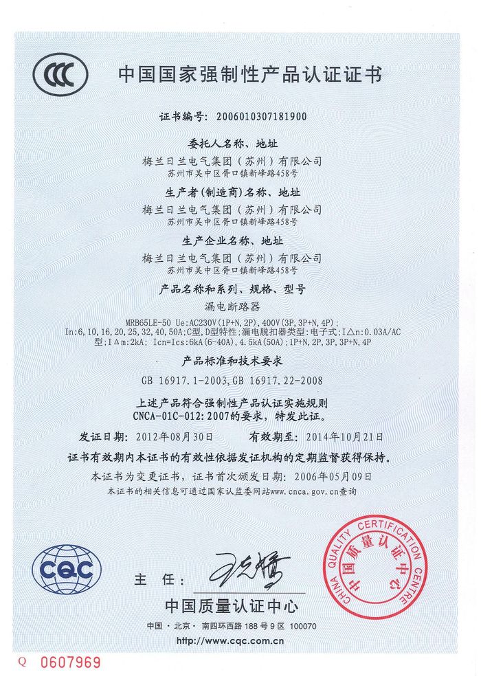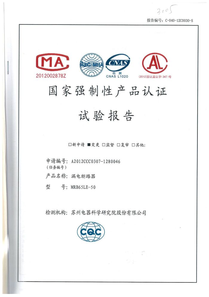 MRB65LE-50漏電斷路器資質(zhì)證書