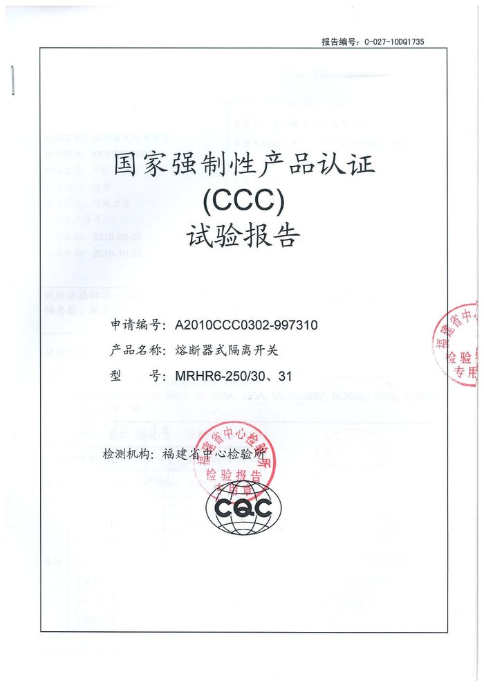 MRHR6-250熔斷隔離開關(guān)資質(zhì)證書