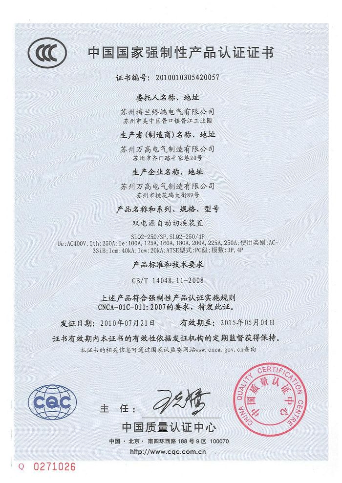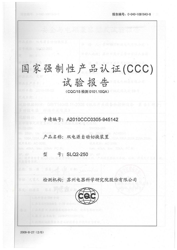 SLQ2-250雙電源資質(zhì)證書
