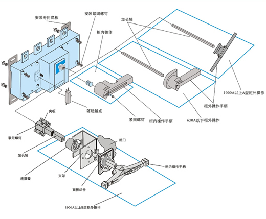 手柄可直接裝在開關(guān)上操作(簡稱柜內(nèi)操作),也可通過加長軸在配電柜門外操作(簡稱柜外操作),提供操作方便。
