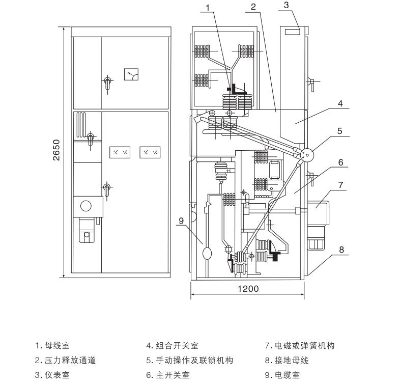 本開關(guān)柜為金屬封閉箱型結(jié)構(gòu),柜體骨架由角鋼焊接而成.柜內(nèi)用鋼板分隔成斷路器室,母線室,電纜室,繼電器室,并可通過門面上的觀察窗和照明燈觀察柜內(nèi)各主要元件的運行情況。為提高開關(guān)柜的技術(shù)性能,各主要元件進(jìn)行了重新設(shè)計(如斷路器,旋轉(zhuǎn)式隔離開關(guān)等),根據(jù)柜體布置,繼電器室可安裝繼電器,門上可裝設(shè)信號繼電器、指示儀表、信號燈,轉(zhuǎn)換開關(guān)安裝于操作小室。后面為母線室,下面為電纜室,用戶可方便地進(jìn)行接線,前面為斷路器室,方便了開關(guān)柜主開關(guān)的檢修,柜體內(nèi)部機(jī)構(gòu)參見圖1、圖2和產(chǎn)品說明書。