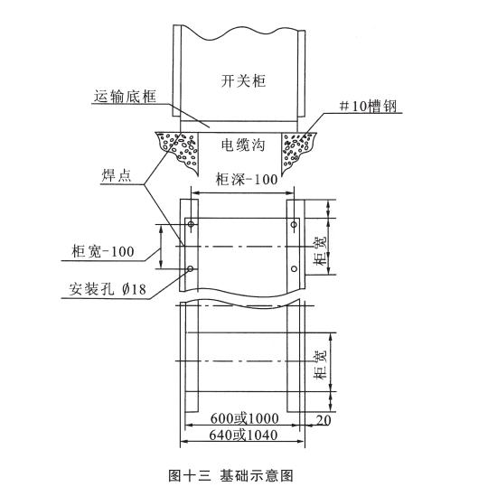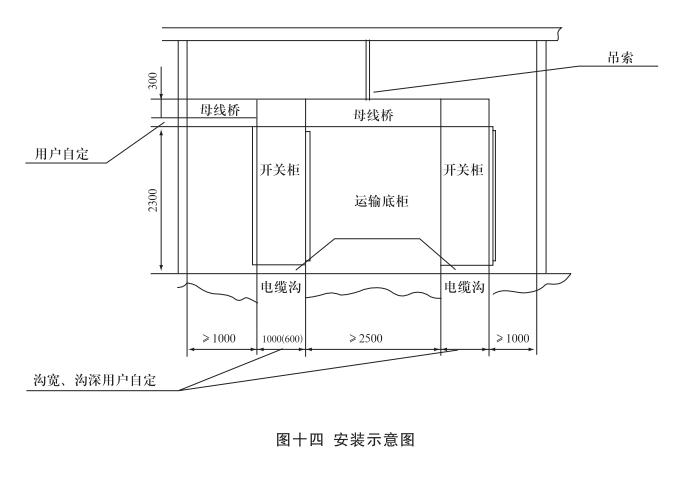 安裝:開(kāi)關(guān)柜就位。找準(zhǔn)位置,按圖十一所示進(jìn)行焊接,焊接節(jié)柜和焊長(zhǎng)由用戶確定,產(chǎn)品安裝與配電室的相對(duì)位置參考圖十二,其中吊索是否安裝由用戶確定,制造商提供的原則是:當(dāng)母線橋的長(zhǎng)度大于3米時(shí)應(yīng)考慮安裝吊索。但是,當(dāng)母線橋的電流大于或等于2500A時(shí),其長(zhǎng)度為2.5米時(shí)也應(yīng)安裝吊索。