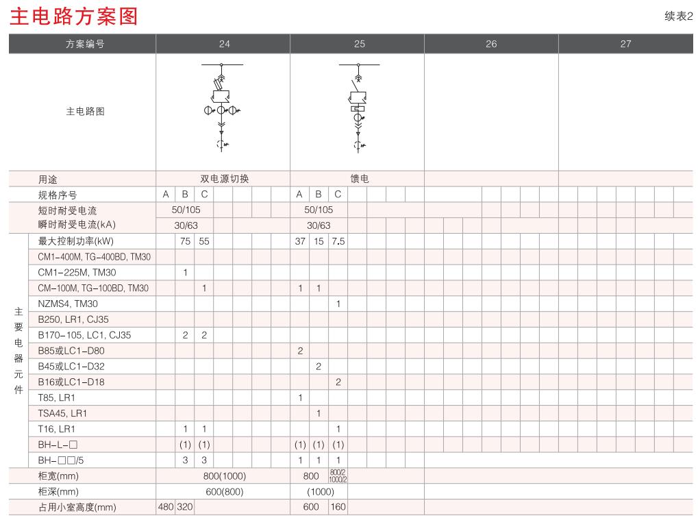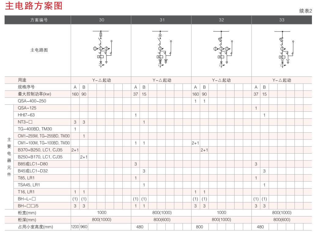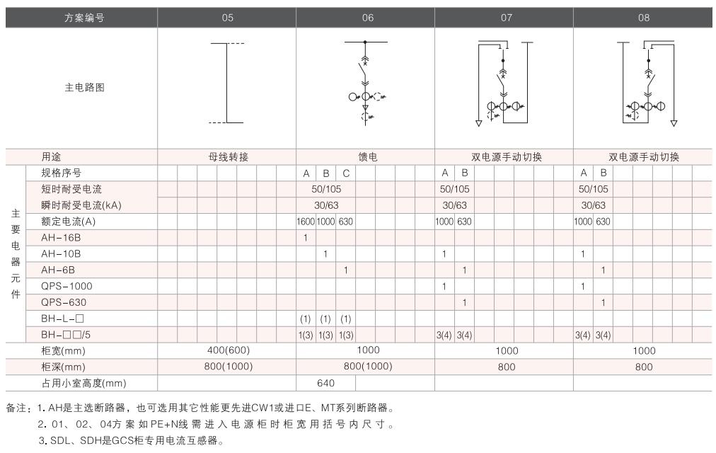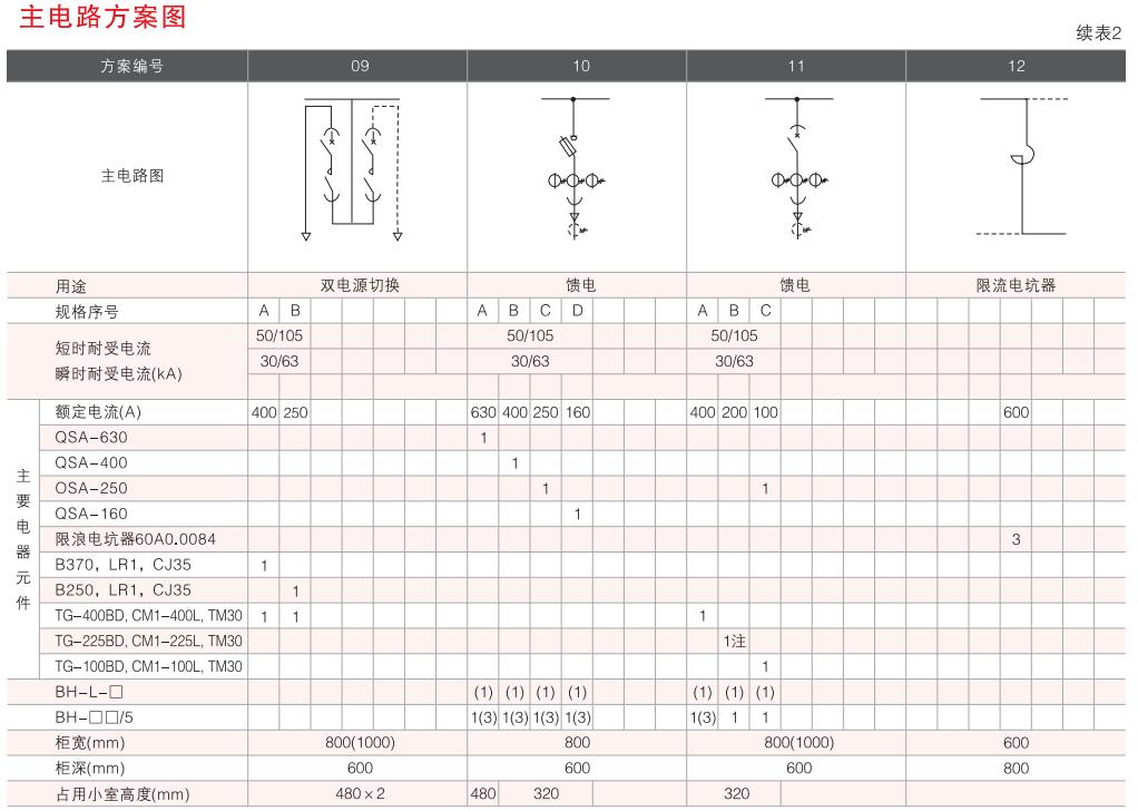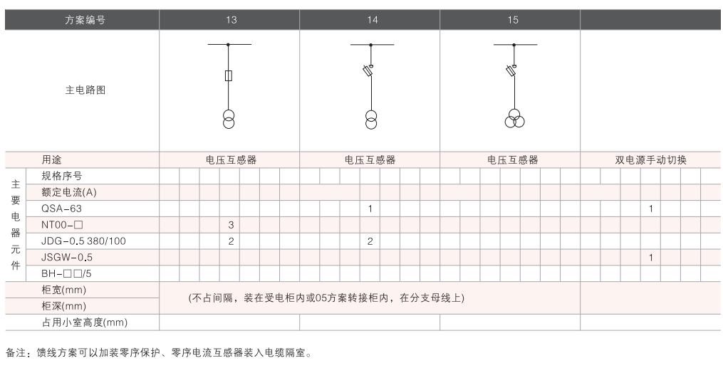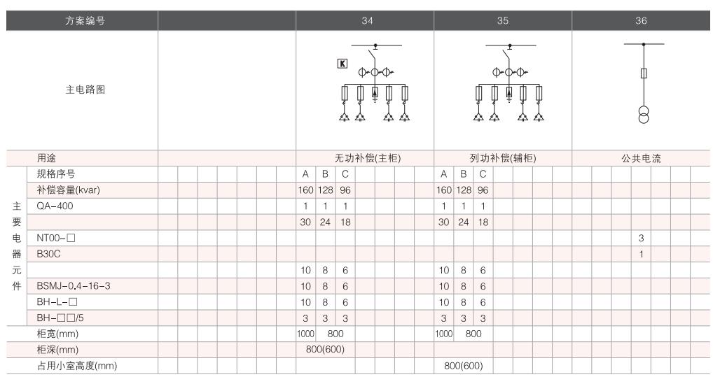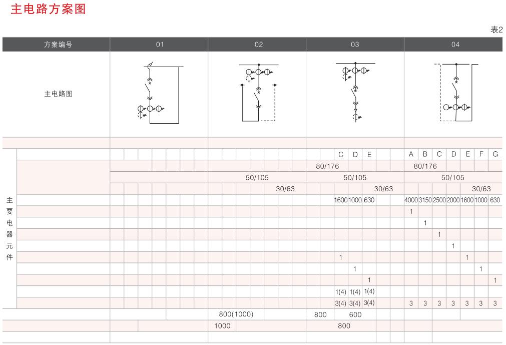 開(kāi)關(guān)設(shè)備主電路方案共32組118個(gè)規(guī)格(見(jiàn)表2).不包括由于輔助電路的控制與保護(hù)的變化而派生的方案和規(guī)格。包括了發(fā)電、供用電和其它電力用戶的需要,額定工作電流為4000A,適合2500kVA及以下的配電變壓器選用。